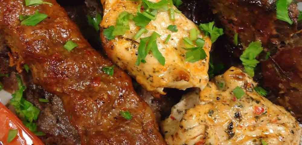 Shoarma met adanakabab en kofta'. en lams kotelet en kippenvleugels en brood en patat en rijst en salada